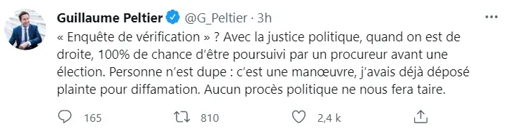 Guillaume Peltier n'a pas tardé à réagir : via son compte Twitter, l'intéressé a raillé la notion d'enquête "de vérification", estimant qu'avec "la justice politique", quand on est de droite, on a "100% de chance d'être poursuivi par un procureur avant une élection". Puis le député solognot commente : "Personne n'est dupe, c'est une manoeuvre" en rappelant qu'il avait pris soin, déjà, de déposer plainte pour diffamation et assénant, en conclusion "Aucun procès politique ne nous fera taire".